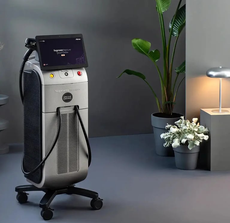 At Raya Aesthetics, we use Soprano ICE Titanium — combining 3 wavelengths in one system for faster, safer, and more effective hair reduction.
